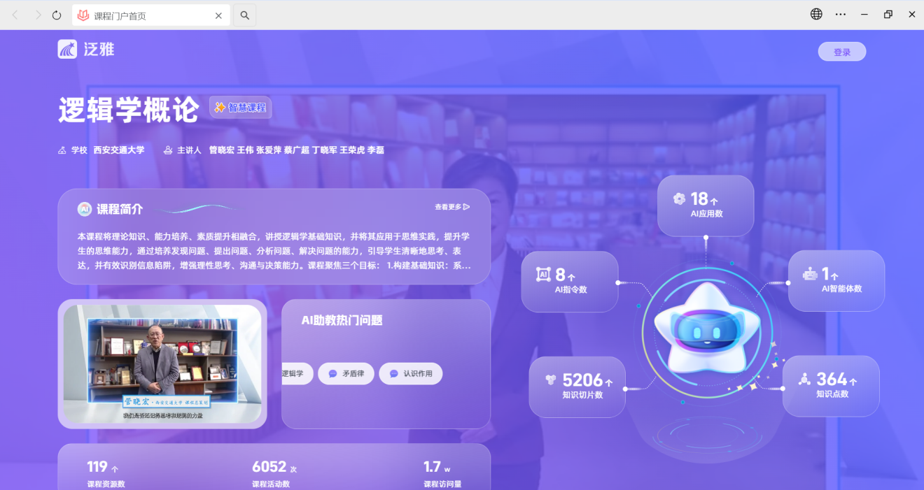 “逻辑学概论”课程基于我校逻辑学教学多年的建设基础与探索实践,致力于将传统的逻辑学专业基础课程,转变为通识核心素养课程,培养学生“懂逻辑、善思考、能应用、会创新”的高阶思维能力。团队提出了“三模块、三层次”的课程内容体系,开发了以真实问题为导向的教学案例,设计了从澄清概念到理性决策的全链条思维训练,并搭建了跨校“资源共享、课程共建、多方共赢”的协同机制,确保了课程的基础性、普适性与实用性,为三秦学子提供优质的智慧课程与思维训练平台。