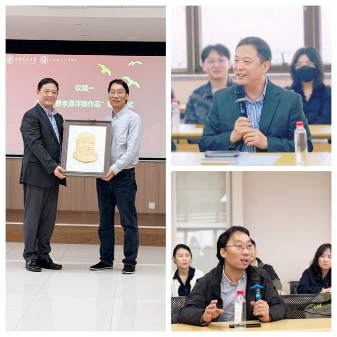 抚今追昔,边燕杰教授深情回顾了费孝通先生的学术风范。结合南开班求学与香港科技大学共事经历的珍贵回忆,边老师系统梳理了费老与西安交大社会学学科的深厚渊源,细数往昔温暖点滴。他高度赞扬了苗祥瑞老师精湛的创作技艺与无私的奉献精神,并以“师生相济、一脉相承,党引方向、校院飞腾”十六字寄语,勉励大家继承先贤遗志,推动学科发展。苗祥瑞老师介绍了创作心路,表达了对佳作落户实证社会科学研究所的欣慰,并期待两系以此为契机,深化交流,友谊长存。