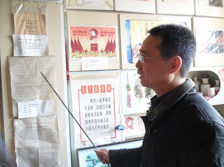 雷氏“文革”博物馆的创办人是中国收藏家协会会员、民建陕西省委理论委员、渭南市政协常委、管理心理学教授雷转运老师。雷教授从二十世纪八十年代后期开始,响应巴金先生的倡议,倾心尽力,征集收藏“文革”资料、物品十万余件,创办了雷氏“文革”博物馆。雷教授的藏品是在家中进行展出,一进到雷教授的家中同学们就被琳琅满目的收藏品所吸引,桌子上、墙上、床上都摆满、贴满了各种“文革”时期的物品。有被国家列为现代文物的纪念章、微雕毛泽东诗词的纽扣章、各省市各地发行的各种票证、红卫兵的红袖章、大小子报、“文革”时期的杂志书籍、具有珍贵历史价值的图片、照片等等,用雷教授自己的话说就是“我们的展品不全但是涉及范围广,我希望为大家立体地展现那个年代的风貌”。大家应接不暇地观看着这些展品,也好像一下子被这些展品带回了那个年代。