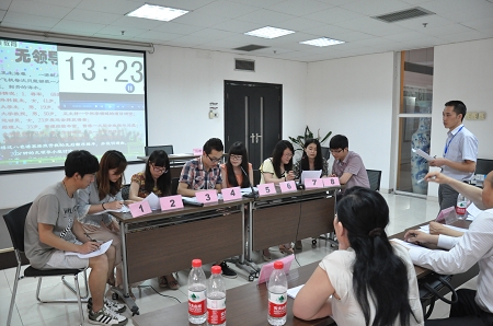 活动的第三个环节是模拟小组招聘即无领导小组讨论。由自愿参与的8名同学组成一个讨论小组,不事先分配任何角色,而是由在讨论中自觉形成的职位和角色进行考核。这次的题目是在船只漏水后,对于八个不同身份、职业、年龄、性别的人以何种顺序施以营救的问题。在选手讨论的同时,下面的同学也积极讨论并发言,各抒己见。最后,通过15分钟的小组讨论,由一名同学做总结发言。招聘老师随后也对讨论中每位同学的表现做出了点评,并对领导者和时间控制者提出了表扬。也提出了几点需要注意的问题,如时间问题、讨论标准问题、分组讨论及综合总结问题等等。