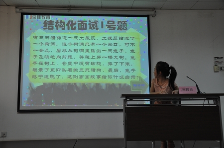 第二环节是本次活动的重点环节——现场模拟招聘。由于时间关系,只有四名随机选出的同学有机会参与。每位同学先进行自我介绍,再由京佳教育集团工作人员当场进行点评,提出意见和建议,之后再随机选择一道题目进行现场考核,并给予评价和建议。上台的几位同学都在规定时间内,对自己的情况做了介绍,但介绍内容都相对比较简单。周浩先生对大家的自我介绍了提出了很多好的建议,例如要有条理,重点要突出,要有相应的事例佐证,不用“大概”“可能”“。。。吧”等非常不确定的词语等。现场考察题目中有一道是关于“狼、土拨鼠、兔子”的一则寓言,每个人对于寓言所受的启发都不尽相同,招聘老师也是通过每个人思考的角度对大家做出了评价和指导。通过四位同学的现场模拟招聘,大家都对招聘过程以及注意事项有了直观、全面的了解,获益匪浅。