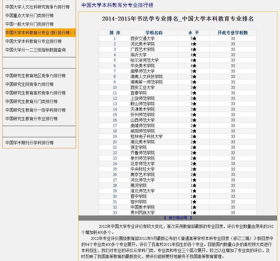 此次参与专业排名评比的院校有33所,主要分为三类,分别是综合性大学、师范类院校和艺术类院校,以书法专业的科研成果和水平作为主要的评比和评价标准。我院书法专业从2005年开始招收首届本科生,到2014年将有十载,专业培养始终坚持理论与实践相结合,注重科研质量和人才培养,此次评比荣膺榜首。
