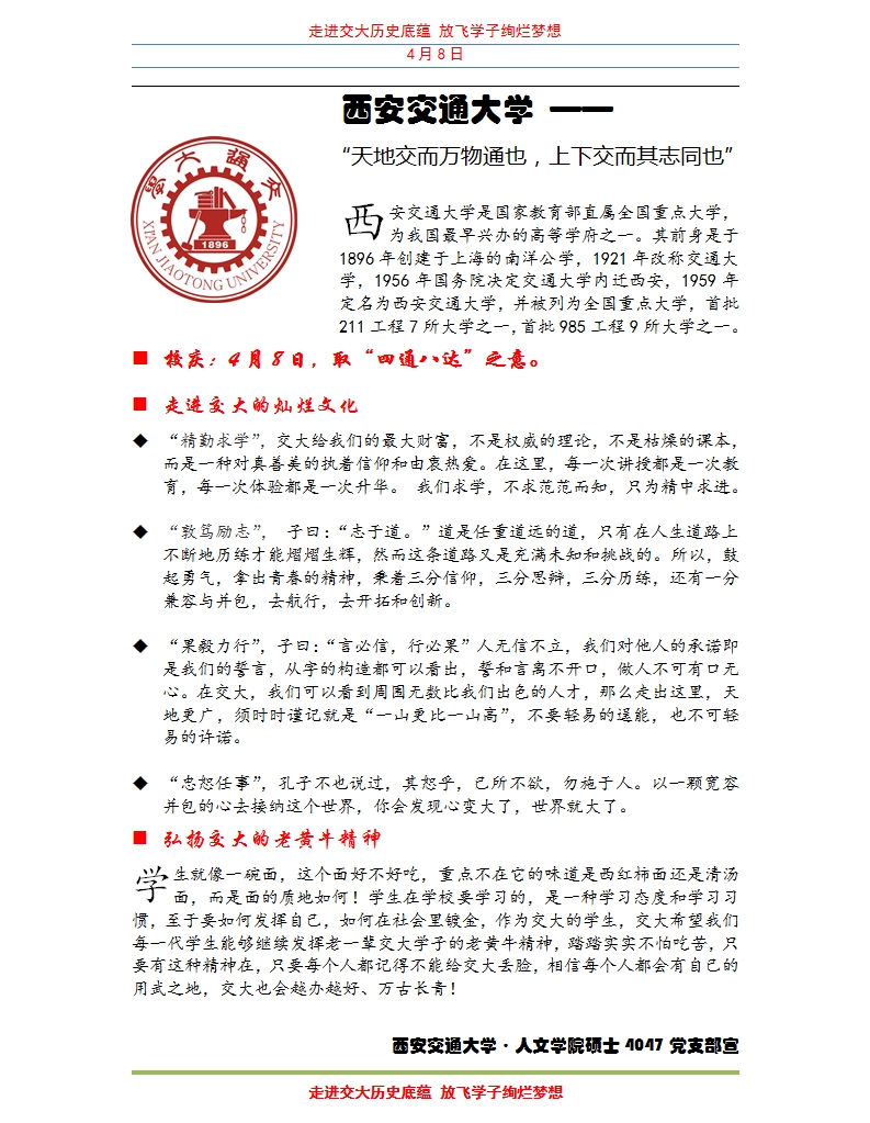硕4047支部的同学们于4月8日在校园内开展了以“走进交大历史底蕴,放飞学子绚烂梦想”为主题的宣传活动。