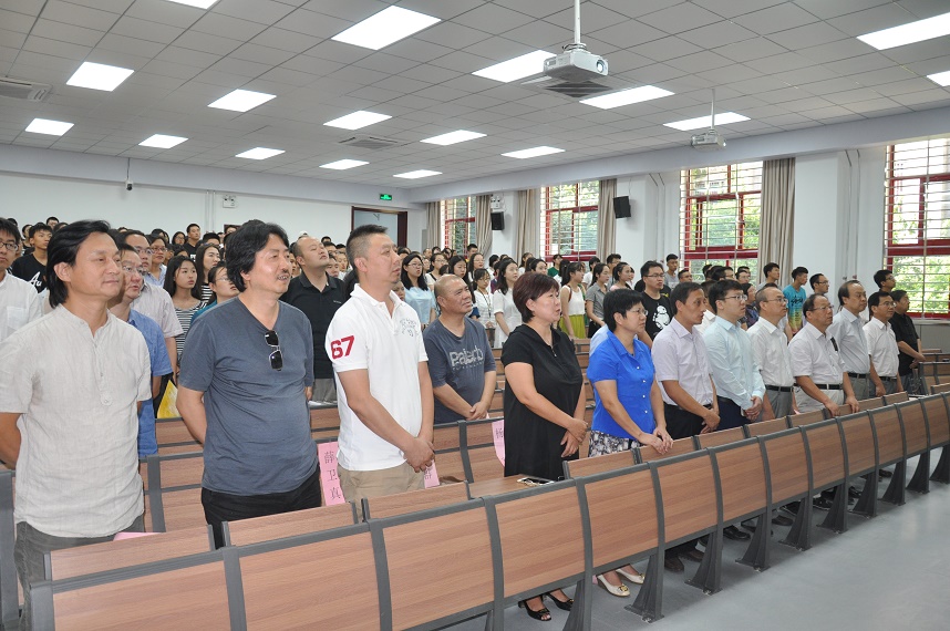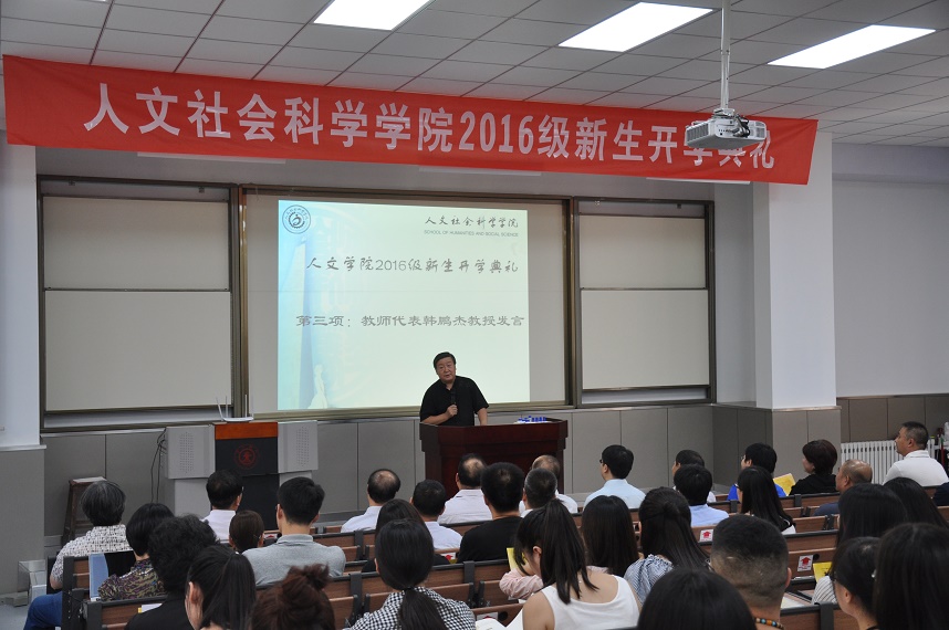 各系所主任也从系所概况、师资队伍、专业发展、毕业生去向等几个方面向新生介绍了各个专业的情况。哲学系的张帆教授从学科的历史沿革强调了哲学学科体系和人才培养体系的完备性;社会学系的张顺教授则用详实的数据介绍了社会学系的师资队伍情况、学生就业及最新的科研成果现状;中文系张勇副教授从基本概况、师资力量、培养目标以及社会影响力四个方面向大家展示了选择学习中文的魅力及其重要意义;传播学系黄蓉副教授为大家介绍传播学系的特色时说道:“首先我要说三个关键词‘年轻’、‘活力’与‘包容’。”通过对三个关键词的梳理,大家对传播学系有了全新的认识;艺术系的张伏虎教授介绍了艺术系的发展以及艺术系毕业生们大好的就业、创业现状和前景,希望同学们能在艺术系学有所获、学有所成;书法系薛养贤教授极具个人风格,他饱含激情地向大家展示了书法专业的魅力,他希望新生们一方面既可以遵守秩序,另一方面又能够突破定式思维,勇于创新。