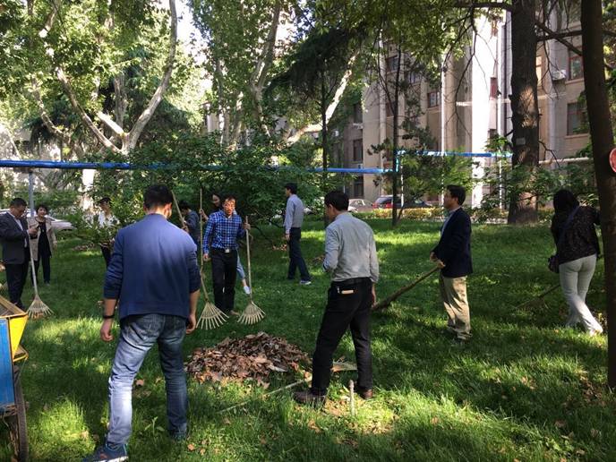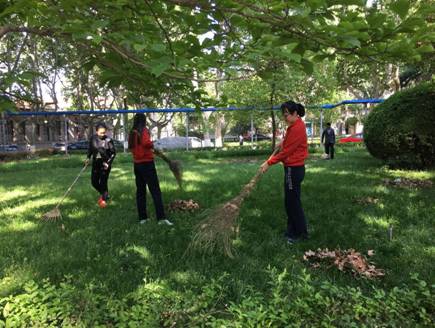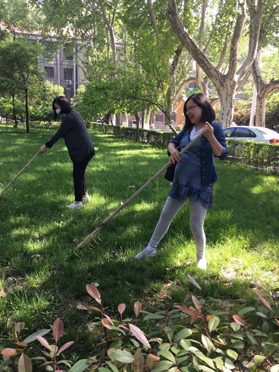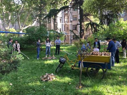 4月28日下午4:00,pg电子app各系工会小组长在陆定一校友爱国爱校校训前进行集合,分发卫生劳动工具,来到东二楼西面和北面中间门洞以西的卫生包干区内进行大扫除工作。在党委马晓彬书记和社会学系、哲学系、中文系、传播学系、艺术系、中国书法系、音乐教育中心和社会心理学研究所等8个系主任、支部书记的带领下,60多名教职员工齐上阵,大家手持耙子或扫帚,将绿花带、草坪以及小竹林中的落叶等垃圾清理出来。