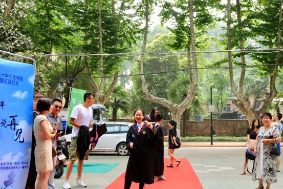 上午九点三十分的阳光洒在就创中心外的梧桐西道上,红毯秀在阳光的映照下正式开始,毕业生们大多身着学位服,携伴陆续走过长长的红毯进入大厅内,接着在签字墙上签上自己的名字,拍照结束后在工作台领取毕业纪念品。整个红毯仪式大约持续十五分钟。