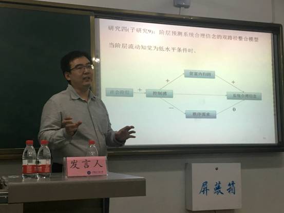 杨沈龙博士做了题为“阶层流动知觉对于低控制感者系统合理信念的影响”的报告,他以基本数据揭示的低控制感者倾向于系统合理化这一现象入手,通过多个研究探讨阶层流动知觉对于这一关系的调节。