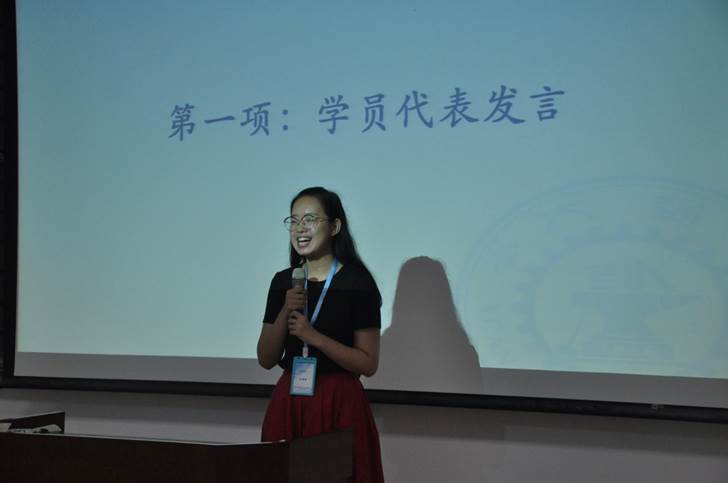 在第一个环节,来自吉林大学的博士生王佳珩作为学员代表上台发言。她激动地讲到,近年来随着社会学量化分析的学术动态,越来越多的高校在暑期都相继开设研究方法相关的课程,并且同样也面向全国高校的师生。西安交通大学实证社会科学研究所的暑期班是其中的一股清流,不仅在九年前就开设了相关课程,而且也是最具良心和最具有性价比的研修班。她认为在这短短的20天中似乎有了当年备战高考的状态,每天早出晚归,每天都有感悟,每天都有收获。