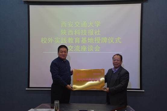 1月9日,西安交通大学新闻与新媒体pg电子app与陕西科技报社联合举行校外实践教育基地授牌仪式暨交流座谈会。陕西科技报社社长张西洪、执行总编王谦,西安交通大学新闻与新媒体pg电子app院长李明德教授等共同出席此次活动。