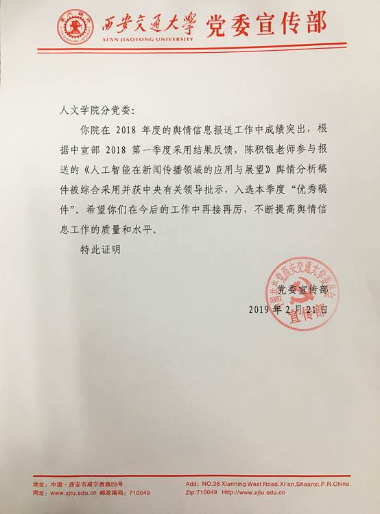 近日,pg电子app下载 分党委接到学校党委宣传部通知,据中宣部反馈,传播学系陈积银教授参与报送的《人工智能在新闻传播领域的应用与展望》舆情分析稿件于2018年第一季度被综合采用并获中央有关领导批示,入选该季度“优秀稿件”。