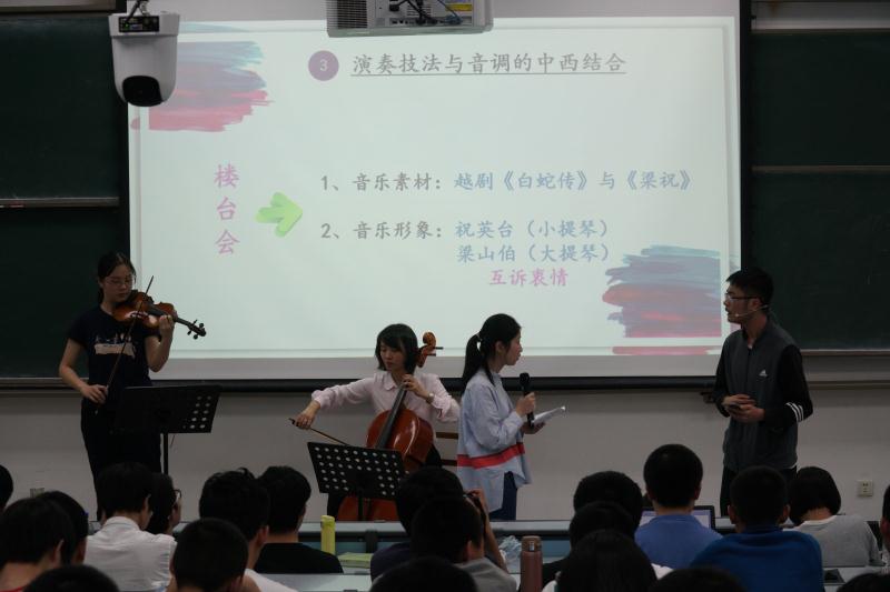 2019年4月19日晚,第二次《交响音乐赏析》全国互动见面课在西安交通大学再次闪亮登场。本次课程的主题是“小提琴协奏曲《梁山伯与祝英台》民族化因素的解析与欣赏”。主讲教师文茹老师对这次见面课进行了精心的设计,以课程讲述、现场演奏、主题学唱、情景再现的师生互动方式进行授课。本次见面课既有内涵而又生动活波的授课方式激起了学生们极大地兴趣和参与的热情。