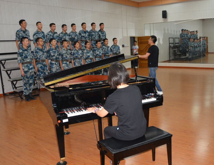 学博军同学一身戎装,以一首四声部的合唱《游击队歌》闪亮登场,歌声铿锵有力,快慢有致。弱声之处引发观众的浮想,强声之处又让所有人振奋,同学们用歌声再现了当年抗战游击的热烈场面。