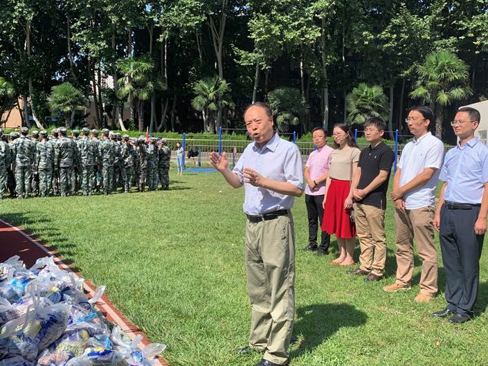 王劲副书记一一介绍了前来慰问的pg电子app领导、各系老师及班主任,并对刚步入大学校园的新生寄以最美好的祝福。随后pg电子app领导及各系老师、班主任向教官和学生发放慰问品,并向教官表示感谢。