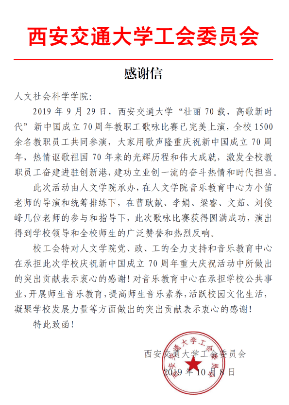 在为期一个多月的排练过程中,音乐中心的老师们利用课余时间,前往学校各个单位对老师进行了专业的指导。在大家共同努力下,各单位合唱的水平得到了长足的进步,并在比赛中取得了圆满的成功,演出得到了学校领导和全校师生的广泛赞誉和热烈反响。西安交通大学工会对音乐教育中心老师们的倾情付出给予了高度的赞扬与肯定。