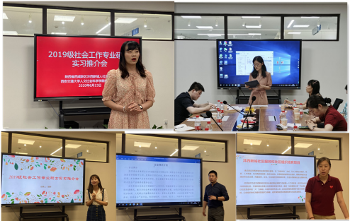 沣西新城人社民政局代表孟珊向社会工作专业师生介绍了实习单位的总体情况以及本单位对于实习工作的需要与要求。随后,参与本次实习工作的各单位与组织,包括陕西省社会组织服务中心天福和园社区项目代表胡妍、沣西新城乐善同方社会工作服务与发展中心代表孟庆珍、全乐居家养老服务中心代表薛峰、西安交通大学教育基金会代表王文,分别向社会工作专业硕士生介绍了本单位的基本状况、需求以及实习工作安排。