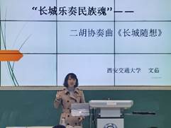 音乐教育中心文茹老师主讲。课堂上通过二胡协奏曲《长城随想》创作时的一段令人难忘的特殊情缘引入课程内容,从《长城随想》的精神内涵、《长城随想》的民族神韵、“中西融合”的音乐体裁、“雅俗共赏”的音乐语言和“传统与创新”相互交融的创作理念对作品进行了全方位的解读。