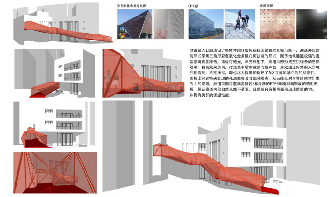 地铁站入口廊道设计整体考虑打破传统校园建筑的直板与统一,通道外部建筑形式采用三角形彩色氧化金属板几何拼装的形式,赋予地铁通道极强的造型感与视觉冲击。面板可透光,阳光照射下,廊道内部形成交织线条的光影效果,自然效果加持,行走其中增添徒步的趣味性。身处通道内外的人亦可互相看到,不觉压抑,却也尽大程度的保护了A区宿舍同学生活的私密性。面板上经过特殊处理的孔洞能够吸收部分噪声,从而降低对宿舍区同学们生活上的影响。廊道顶部可覆盖高抗污/易清洗的ETFE薄膜材料制成的透明盖板,保证廊道内部自然光线不受阻,且质量只有相同面积玻璃质量的1%,并具有良好的保温性能。