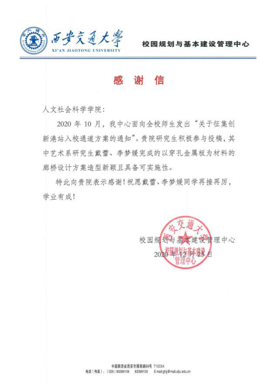 研究生积极参与投稿。2020年12月25日,校园规划与基本建设管理中心向我院艺术系研究生戴蕾、李梦媛同学致以感谢信,祝愿她们再接再厉,学业进步!